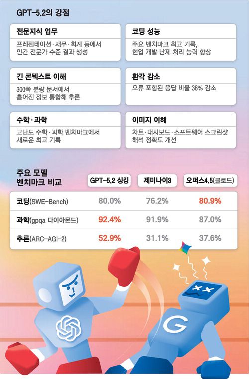 구글이 차세대 인공지능(AI) 모델 '제미나이3'로 세계 최고 성능을 달성했다고 선언한 지 한 달도 채 지나지 않아 오픈AI가 'GPT-5.2'를 공개하며 반격에 나섰다. 오픈AI는 '콘텐츠 제국' 월트디즈니컴퍼니와 손잡고 동영상 AI 시장 공략에도 본격 나섰다.