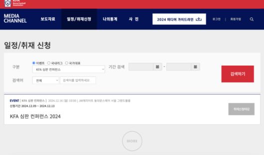 지난해에는 컨퍼런스 개최전 취재신청을 받았다. 따라서 올해 개최일이 15일이라면 현재 취재 신청 공지가 올라와야 한다. 하지만 대한축구협회 미디어 홈페이지에는 취재 신청 공지가 없다.