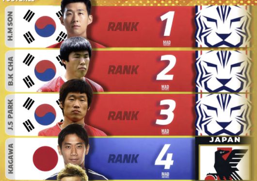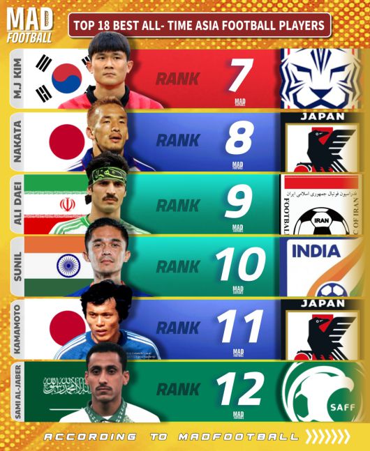 축구 콘텐츠 매체 매드풋볼은 13일(한국시간) '아시아 역대 최고 선수 TOP 18(Top 18 Best All-Time Asia Football Players)' 순위를 공개했다.