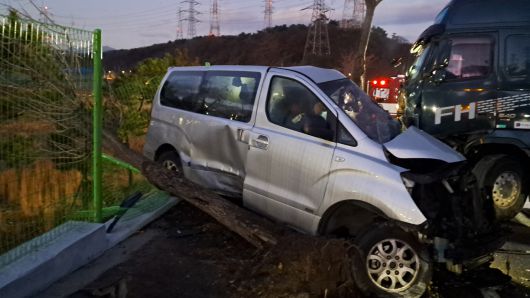 오늘(13일) 새벽 6시 반쯤 울산시 남구 바커케미칼코리아 울산공장 앞 도로에서 탱크로리 차량이 중앙선을 넘어 마주 오던 승합차와 충돌했습니다.
