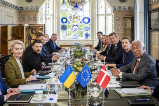 볼로디미르 젤렌스키(왼쪽 두 번째) 우크라이나 대통령이 7월3일(현지 시간) 덴마크 오르후스의 마르셀리스보르성에서 열린 덴마크의 유럽연합(EU) 순회 의장국 출범 행사에 참석해 메테 프레데릭센(오른쪽 두 번째) 덴마크 총리 등 유럽정상들과 회담하고 있다. /AP=뉴시스 |