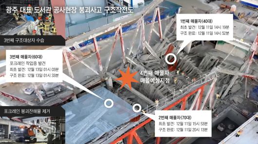 지난 11일 오후 1시 58분쯤 광주 서구 치평동 광주대표도서관 공사 현장에서 옥상층 콘크리트 타설 작업 중 붕괴 사고가 발생해 근로자 4명이 매몰됐다.