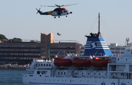 지난달 부산 영도구 국립해양박물관 앞 해상에서 여객선 화재 발생에 따른 다수 인명구조 상황을 가정한 수난대비기본훈련이 진행되고 있다. (사진= 연합뉴스) |