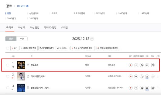 멜론과 지니 성인가요 차트에서도 톱5에 랭크됐다. 임영웅, 장윤정, 영탁 등 국내 대표 트로트 가수들과 함께 이름을 올렸다.