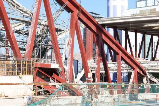 12일 오후 광주 서구 치평동(상무지구)의 광주대표도서관 공사 현장에서 레미콘 타설 중 붕괴 사고로 구조물 안정화와 보강작업을 위해 수색작업이 멈춰있다.뉴스1 |