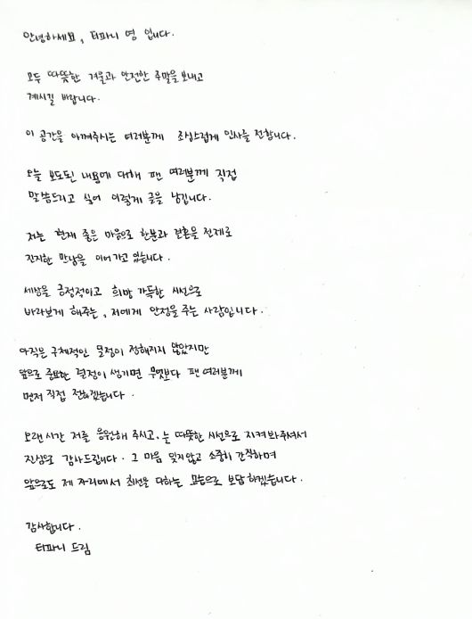 티파니 영은 13일 자신의 SNS에 한 장의 손편지를 공개했다.