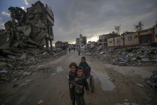 13일(현지시간) 가자시티 동부 알투파 지역 야파 거리에서 팔레스타인 어린이들이 파괴된 건물 사이 임시 거처 인근에서 놀고 있다. 유엔에 따르면 2023년 10월 전쟁 발발 이후 가자지구 인구의 약 90%에 해당하는 190만 명이 집을 떠난 상태다./EPA 연합뉴스 |