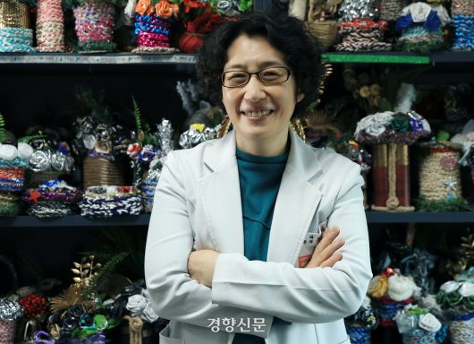 내과 전문의 최영아씨가 지난 12월 9일 서울 은평구 서북병원 연구실에서 주간경향과 인터뷰 도중 환히 웃고 있다. 그의 뒤로 그간 환자들이 준 선물 포장지를 재활용해 직접 만든 장식물들이 놓여 있다. 서성일 선임기자 |