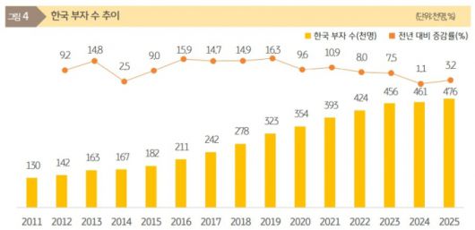 14일 KB금융지주 KB경영연구소가 발간한 '2025 한국 부자 보고서'에 따르면 금융자산 10억원 이상을 보유한 한국 부자는 2011년 약 13만명에서 2025년 약 47만6000명으로 증가했다. 연평균 9.7% 증가하면서 같은 기간 총인구 증가율(0.5%)을 크게 웃돌았다. 총인구 대비 부자 비중도 0.27%에서 0.92%까지 확대됐다.