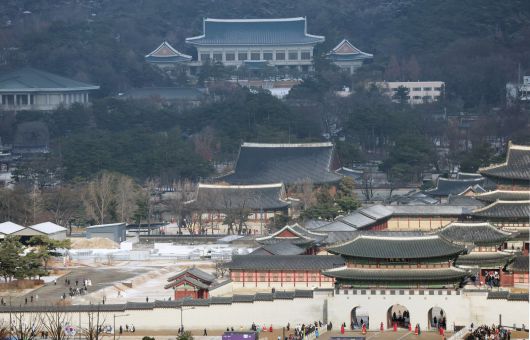 용산 대통령 집무실을 청와대로 이전하는 작업이 성탄절 이전에 마무리 될 것으로 알려진 가운데 14일 서울 종로구 청와대 본관에 흰 눈이 덮여 있다. 2025.12.14/뉴스1 ⓒ News1 |