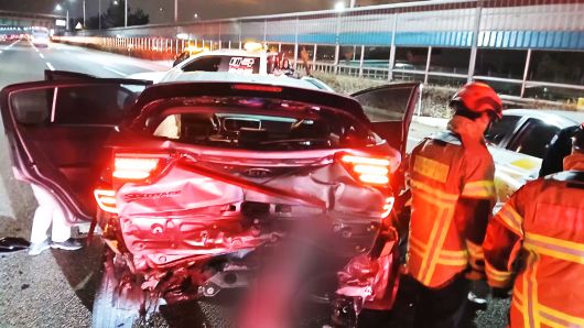 [경찰 관계자 : 비상등이 켜져 있고, 켠 상태에서 이게 정체가 돼 있었고 그래서 그 뒤에 있던 택시가 이제 또 졸음운전을 하셨더라고요.]