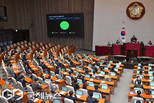 (서울=국제뉴스) 14일 서울 여의도 국회에서 열린 제430회 국회(정기회) 제1차 본회의에서 경찰관 직무집행법 일부개정법률안이 재석 174인 중 찬성 174인으로 가결되고 있다./사진=이용우 기자