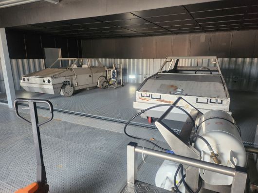 2층 높이로 쌓아 올린 컨테이너에는 ‘친환경차 훈련시설’이라는 문구가 적혀 있었다. 미국 전기차 브랜드 차량을 실측해 제작한 모형 차량 두 대가 놓여 있었고, 화재 확산을 막기 위한 대형 덮개와 화재 후 차량을 침수하는 소화수조도 바닥에 펼쳐져 있었다. 바닥과 벽 곳곳엔 최근까지 화염을 견뎌낸 흔적인 그을음이 남아 있었다. 센터 외부 역시 실제 상황을 그대로 옮겨왔다. 전기충전기와 주유기 등 각종 장비 모형이 배치돼 있었고, 이들 특수 모형들은 전기·수소차 화재의 폭발적 열기와 연소 특성을 최대한 현실적으로 재현하도록 설계됐다.