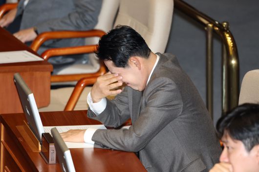 11일 서울 여의도 국회에서 열린 본회의에서 장동혁 국민의힘 대표가 눈가를 만지고 있다. /뉴스1 |