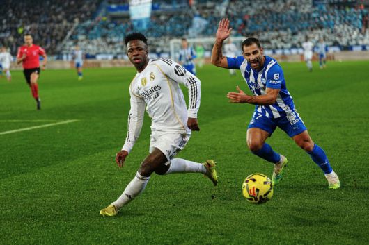 [비토리아=AP/뉴시스] 레알 마드리드의 비니시우스 주니오르(왼쪽)가 14일(현지 시간) 스페인 비토리아의 에스타디오 데 멘디소로차에서 열린 2025-26 라리가 16라운드 알라베스와 경기 중 공을 다투고 있다. 레알 마드리드가 2-1로 승리하고 2위를 유지했다. 2025.12.15.
