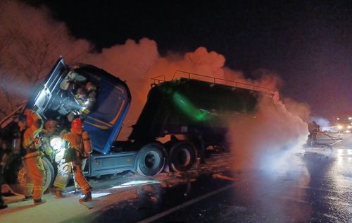 (칠곡=연합뉴스) 김선형 기자 = 15일 오전 6시 7분께 경북 칠곡군 북삼읍 오평리 한 도로에서 25t 탱크로리 차량이 6.5t 윙바디 화물차를 추돌하며 불이 났다.