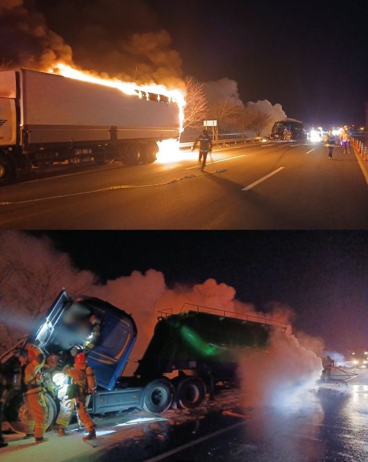 오늘(15일) 오전 6시 7분쯤 경북 칠곡군 북삼읍 오평리 한 도로에서 25t 탱크로리가 주행 중 6.5t 윙바디 화물차를 뒤에서 들이받는 사고 뒤 화재가 발생했다. [화면제공=경북소방본부] |