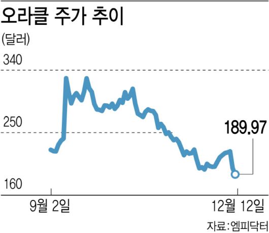 앞서 11일 오라클 주가는 실망스러운 3분기 매출에 10% 넘게 하락했다. 여기에 주요 고객사 오픈AI용 데이터센터 완공이 1년 연기되었다는 소식까지 더해지면서 다음날 추가 하락했다. 오라클 주가는 9월 고점 대비 40% 넘게 밀렸다.