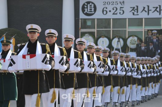 [이데일리 방인권 기자] 15일 서울 동작구 서울현충원 현충관에서 열린 '2025년 6·25 전사자 합동 봉안식'에서 국군의장대가 영현을 봉송하고 있다.