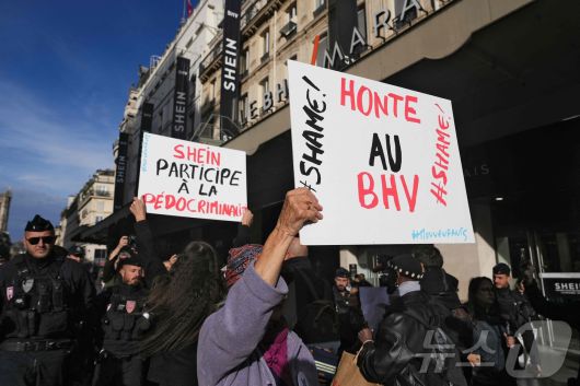 5일(현지시간) 쉬인이 첫 오프라인 매장을 연 프랑스 파리 BHV 마레 백화점 앞에서 한 여성이 'BHV는 부끄러운 줄 알라'(Shame on BHV)라고 적힌 피켓을 들고 있다. 2025.11.05. ⓒ AFP=뉴스1 |