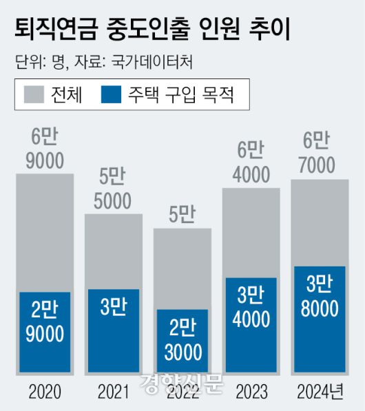 중도 인출 사유로 주택 구입(56.5%)이 가장 많았다. 1년 전보다 3.8%포인트 늘어난 수치다. 이어 주거 임차(25.5%), 회생 절차(13.1%) 순이었다. 지난해 주택 구입 목적 중도 인출 인원은 3만8000명, 금액은 1조8000억원으로, 인원과 금액 모두 2015년 통계 집계 이래 최대치였다.