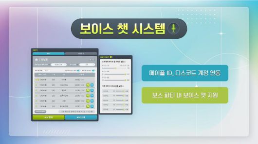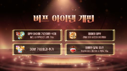 ‘크라운(CROWN)’ 개선사항 또한 공개했다. 보이스 챗 도입, 버프 매니저 시스템 추가, 버프 아이템 개편, 소울 컬렉션 개편, 월드 메소 통합, 5차 전직 V매트릭스 개편, 성별 전환권 추가, 하이퍼 스탯 프리셋 변경 비용 삭제, 6차 전직 퀘스트 난이도 완화, 유니온 등급 자동 성장 등 게임 이용 경험을 개선하는 다채로운 업데이트를 적용한다.