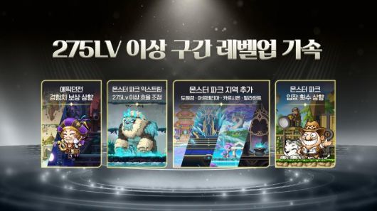 게임 성장 경험에 관한 다양한 개편사항도 발표했다. 먼저, 에픽 던전 경험치 보상을 전 레벨 구간에서 샹향하고, 몬스터파크 익스트림 콘텐츠는 275 레벨 이상 참여 시 획득할 수 있는 경험치를 상승시키는 등 275레벨 이상 구간 레벨업 가속을 위해 일부 콘텐츠의 경험치 보상을 개편한다. 또, 285레벨 달성 시 주어지는 ‘찬란한 영웅의 증거’로 원하는 링크 스킬을 3레벨로 확장할 수 있도록 지원하고, ‘어센틱 심볼’ 11레벨 달성 시 지역별 정해진 보스를 상대로 데미지 20% 증가 등의 추가 혜택을 제공한다.