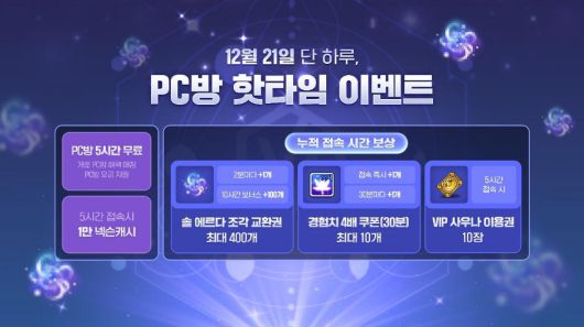12월 21일 하루 동안에는 5시간 무료 플레이 등의 대규모 혜택을 제공하는 PC방 이벤트를 실시한다. 게토 PC방 혜택 매장에서 ‘메이플스토리’를 플레이하면 5시간 무료 플레이 혜택을 이용할 수 있으며, 당일 접속 시간에 따라 최대 ’1만 ‘넥슨캐시’, ‘솔 에르다 조각’ 400개, ‘경험치 4배 쿠폰 (30분)’ 10개 등을 획득할 수 있다.