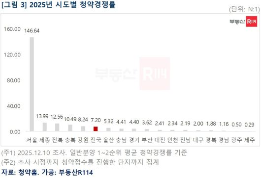 실제 올해 전국 평균 청약경쟁률은 7.20대 1이었으나, 수도권은 10.07대 1이었고 지방은 4.53대 1로 두 배 이상 격차를 보였다. 특히 서울의 평균 청약 경쟁률은 146.64대 1을 기록했고, 강남·성수 등 주요 입지에서는 600대 1을 넘는 경쟁률도 나타났다.