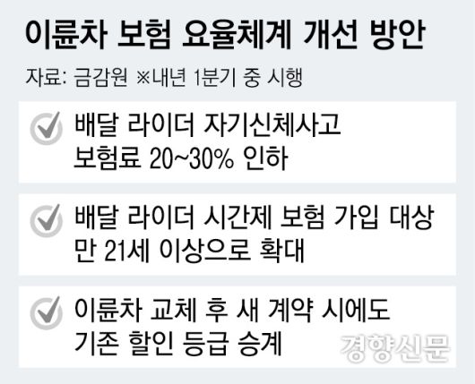 이르면 내년 1분기부터 배달 라이더의 ‘오토바이’ 보험 상품 선택지가 넓어진다. 1년짜리 보험상품 가입이 부담스러운 20대 초반 배달 라이더도 ‘시간제 보험’에 가입할 수 있게 되고, 자기신체사고 관련 보험료가 20~30% 낮아진다. 새 이륜차 보험을 가입할 경우 기존 할인 등급 승계도 허용된다.
