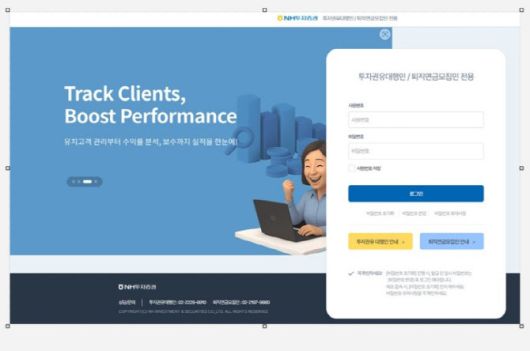 [이데일리 박순엽 기자] NH투자증권(005940)은 투자권유대행인과 퇴직연금모집인의 영업·관리 업무 효율화를 위해 전용 홈페이지를 구축하고 1차 서비스를 오픈한다고 15일 밝혔다.