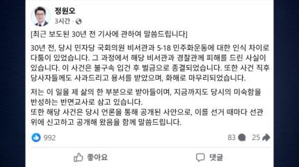 정 구청장은 오늘(15일) 자신의 SNS에, 당시 민주자유당 국회의원 비서관과 5·18 민주화운동에 대한 인식 차이로 다퉜고, 그 과정에서 비서관과 경찰관께 피해를 드린 사실이 있다고 밝혔습니다.