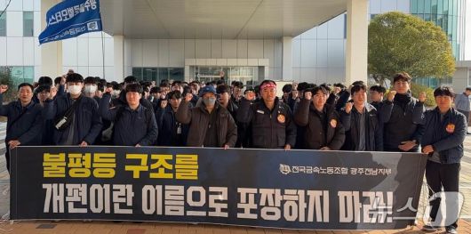 전국금속노동조합 광주전남지부 광주글로벌모터스지회가 15일 광주 GGM 앞에서 인사제도 개편안에 반대하며 구호를 외치고 있다. (지회 제공. 재판매 및 DB 금지) |
