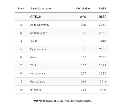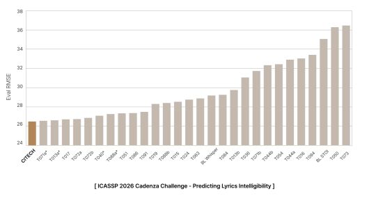 씨아이테크는 2026 IEEE ICASSP(International Conference on Acoustics, Speech and Signal Processing)가 주관하는 CLIP(Cadenza Lyric Intelligibility Prediction) Challenge에서 총 22개 팀, 27개 시스템 가운데 최종 1위를 기록했다.