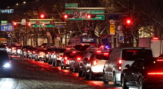 지난 4일 서울 종로구 경복궁역 인근에서 차량이 빙판길에 정체를 빚고 있다. [연합뉴스] |