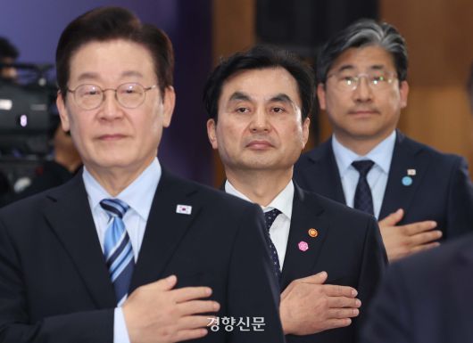 이재명 대통령과 안규백(가운데) 국방부 장관이 지난달 14일 오후 경기 파주시 라이브러리스테이 지지향에서 열린 ‘경기 북부의 마음을 듣다’ 타운홀미팅에서 국민 의례를 하고 있다. 대통령실사진기자단 |