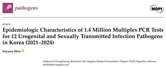 이번 연구는 ‘Epidemiologic Characteristics of 1.4 Million Multiplex PCR Tests for 12 Urogenital and Sexually Transmitted Infection Pathogens in Korea’(2021–2024)라는 제목으로 SCI급 국제학술지 ‘Pathogens(Vol.14, 2025, Article No.1073)’에 게재됐다.