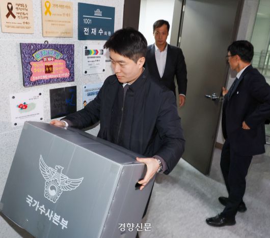 경찰이 15일 통일교 금품 수수 의혹을 받는 전재수 전 해양수산부 장관의 서울 여의도 국회의원회관 사무실 압수수색을 마친 후 압수품을 옮기고 있다. 한수빈 기자 |
