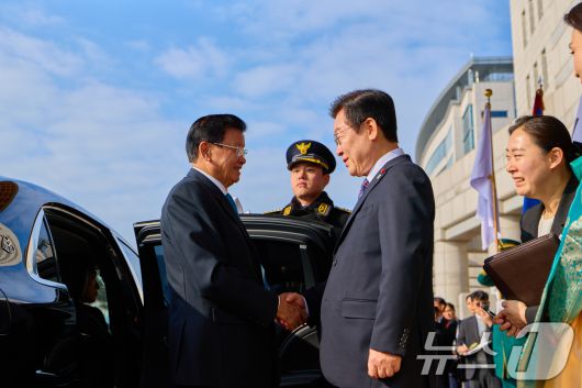 (서울=뉴스1) 허경 기자 = 이재명 대통령이 15일 서울 용산 대통령실에서 통룬 시술릿 라오스 국가주석을 영접하고 있다. (대통령실 제공. 재판매 및 DB 금지) 2025.12.15/뉴스1neohk@news1.krCopyright ⓒ 뉴스1. All rights reserved. 무단 전재 및 재배포, AI학습 이용 금지.