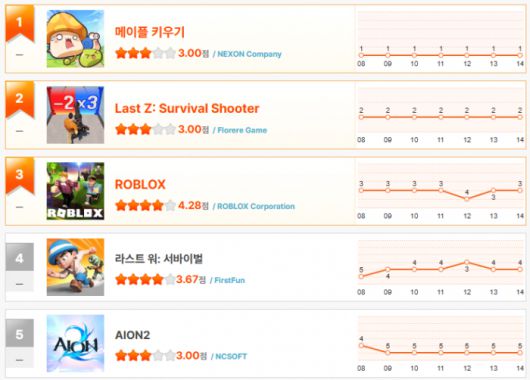 지난주에도 ‘아이온2’와 ‘라스트Z: 서바이벌 슈터’가 연달아 정상에 도전했지만, ‘메이플 키우기’는 끝내 왕좌를 내주지 않으며 장기 집권 체제에 완전히 들어섰다.