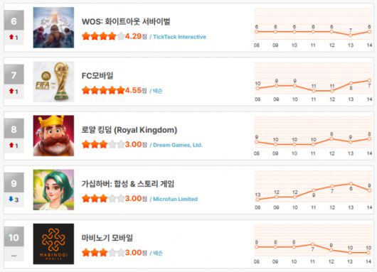 ‘WOS: 화이트아웃 서바이벌’은 2주 연속 상승세를 이어가며 6위에 안착, TOP5 진입을 눈앞에 두고 있다. 한때 9위까지 밀렸던 넥슨의 ‘FC모바일’도 7위로 반등하며 체면을 회복했고, 지난주 10위에 턱걸이했던 ‘로얄 킹덤’ 역시 8위로 올라서며 다시 안정을 찾았다.