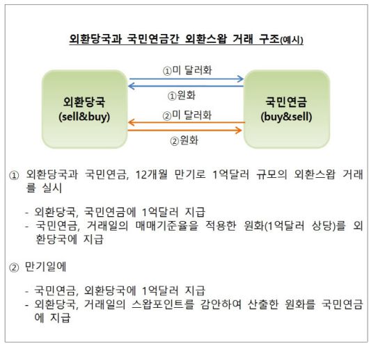 외환당국은 외환 스와프 거래가 외환시장 불안정 시 국민연금의 현물환 매입 수요를 흡수할 수 있어 외환시장 안정에 기여할 수 있을 것으로 기대하고 있다.