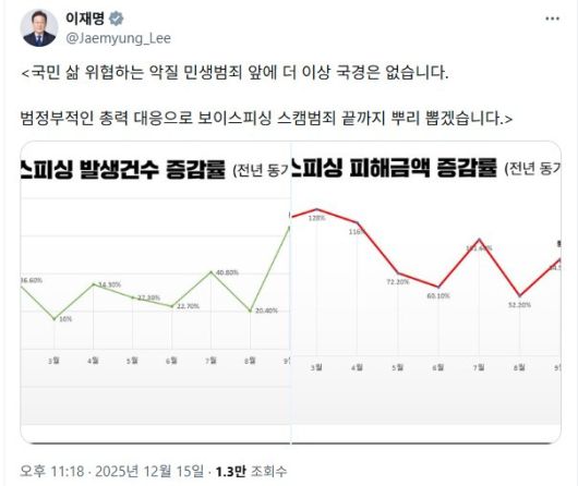 이재명 대통령이 엑스(옛 트위터)를 통해 "범정부적인 총력 대응으로 보이스피싱 스캠범죄를 끝까지 뿌리 뽑겠다"고 말했습니다.