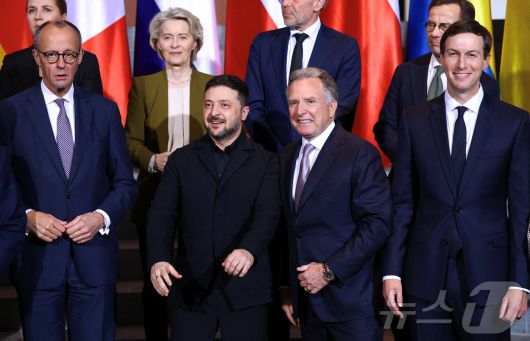 프리드리히 메르츠 독일 총리, 우르줄라 폰데어라이엔 유럽연합(EU) 집행위원장, 볼로디미르 젤렌스키 우크라이나 대통령, 스티브 위트코프 미국 특사, 도널드 트럼프 미국 대통령의 사위 재러드 쿠슈너가 15일(현지시간) 독일 베를린 연방총리청에서 기념사진을 촬영하고 있다. 2025.12.15. ⓒ 로이터=뉴스1 ⓒ News1 윤다정 기자 |