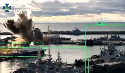 SBU에 따르면 표적이 된 러시아 잠수함은 킬로급 잠수함으로 항구에 정박 중이었고, 우크라이나 영토 공격에 쓰이는 칼리브르 순항 미사일 발사대 4대를 싣고 있었습니다.