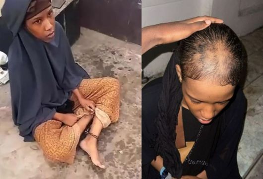 영국인 소녀 아스마 하산 압둘라히(18)가 소말리아 수용소에서 족쇄를 차거나 삭발당하는 등 학대를 받으며 생활한 모습. /사진=영국 매체 데일리메일 갈무리 |