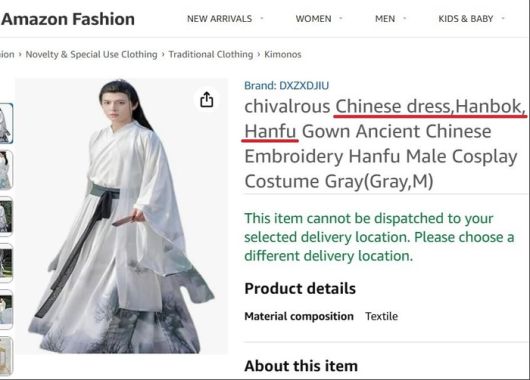 글로벌 전자상거래 플랫폼 아마존에서 중국 전통의상을 ‘한복’으로 표기해 판매해 논란이 일고 있다.