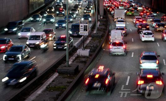 파리 순환도로의 새로운 카풀 전용차로를 알리는 표지판을 지나가는 차량들의 모습. 2025년 3월 6일 파리에서 촬영된 사진.2025.03.06.ⓒ AFP=뉴스1 |
