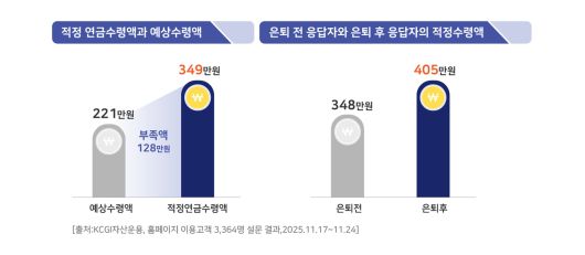 적정 연금 수령액과 실제 예상 수령액 간의 격차는 월평균 128만원에 달했다. 직업별로 보면 공무원과 교직자는 공적 연금 수령 기대가 반영되며 적정 연금 수준을 상대적으로 높게 인식했다. 특히 은퇴 전과 은퇴 후 인식 차이도 컸다. 은퇴 전 응답자가 생각한 적정 연금액은 월 348만원이었지만, 은퇴 후 응답자는 405만원으로 57만원 높았다