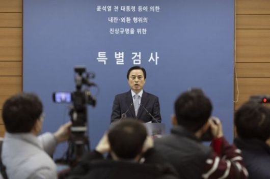 조은석 특검이 15일 서울 서초구 서울고검에서 윤석열 전 대통령의 비상계엄 선포 동기와 최초 준비 시점 등을 포함한 수사 결과를 발표하고 있다. |